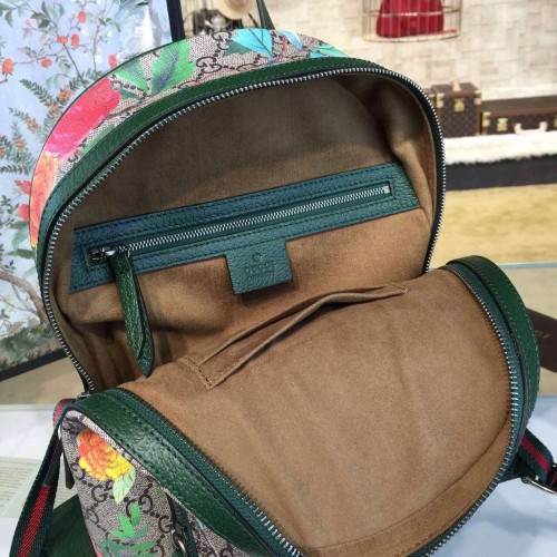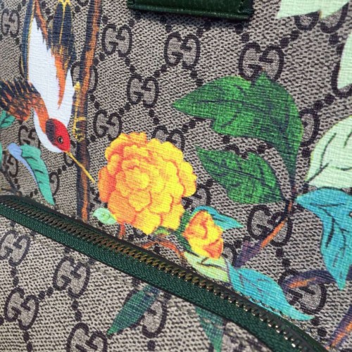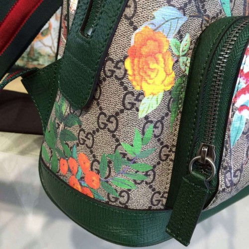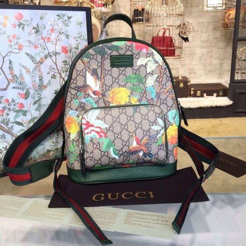A small sized backpack with leather details and green/red/green adjustable shoulder straps. Made in our GG Supreme Tian canvas. Our new Gucci Tian print features a contemporary floral motif inspired by Chinese landscapes depicted on 18th-century tapestries and screens. The floral pattern is made up of flowers, insects and birds-including dragonflies, butterflies and hummingbirds. The plants and creatures are represented through light and quick brushstroke-style graphics, with a three-dimensional effect printed on our GG Supreme canvas. GG Supreme Tian, a material with low environmental impact, with leather trim Front zip pocket Interior pocket for an iPad Two smartphone pockets Signature web straps 25*32*11cm Microfiber lining with a suede-like finish Made in Italy