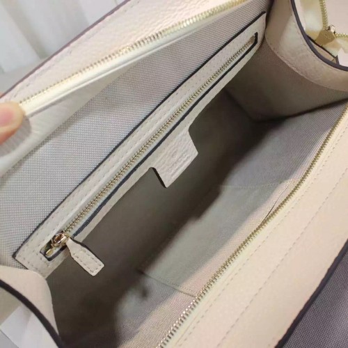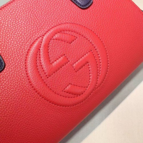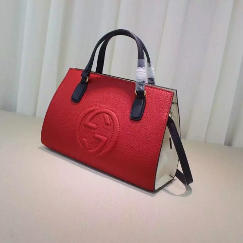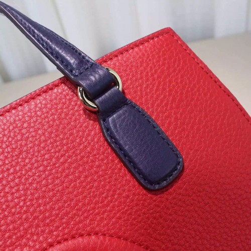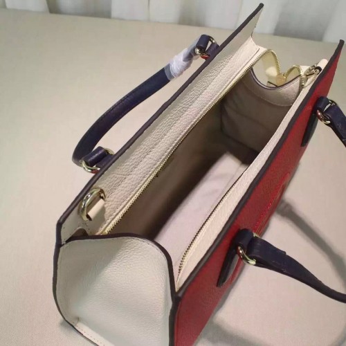 size:32.5*22*10.5 cmA new Soho takes shape for the Fall Winter 2016 collectsion, a simple top handle bag with a structured bottom and optional shoulder strap. Made in our resistant, textured leather.Hibiscus red, blue and white leatherEmbossed interlocking GInterior zip pocket and smartphone pocketsTop handles Detachable and adjustable shoulder strap Zip top closureMedium32.5*22*10.5 cmCotton liningMade in Italy