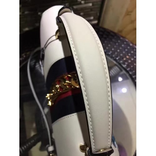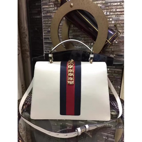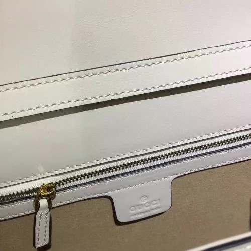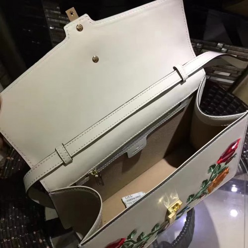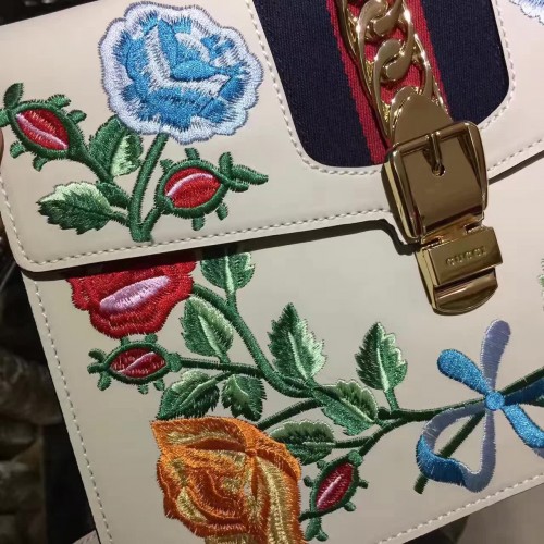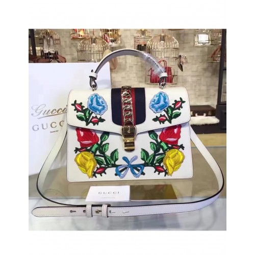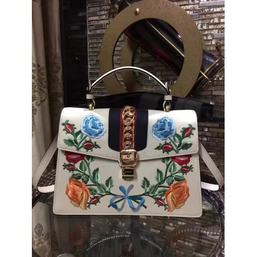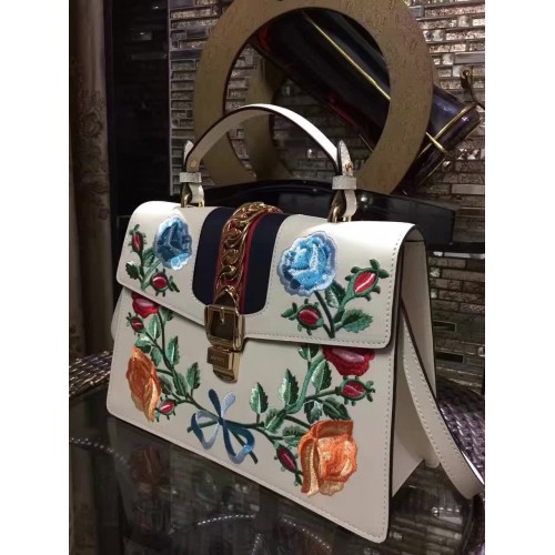Gucci Sylvie Leather Embroidered Flowers Top Handle Medium Bag 431665 White(KDL-722501)