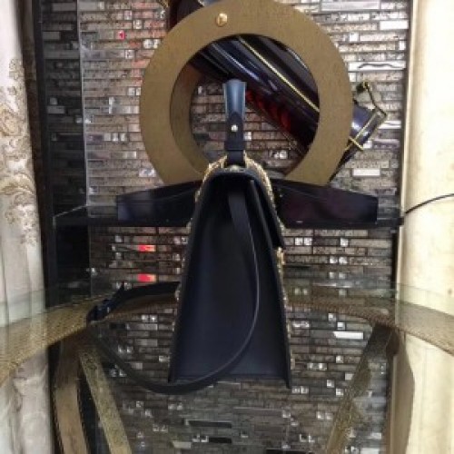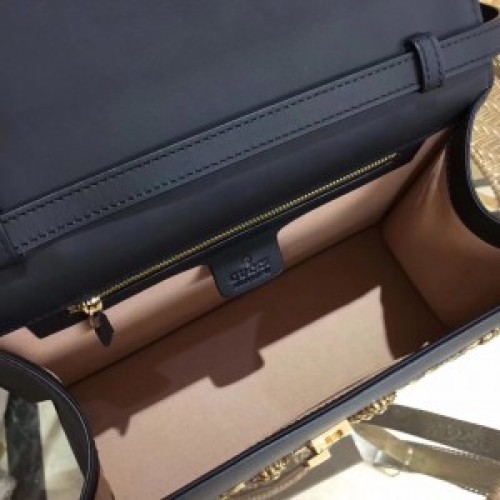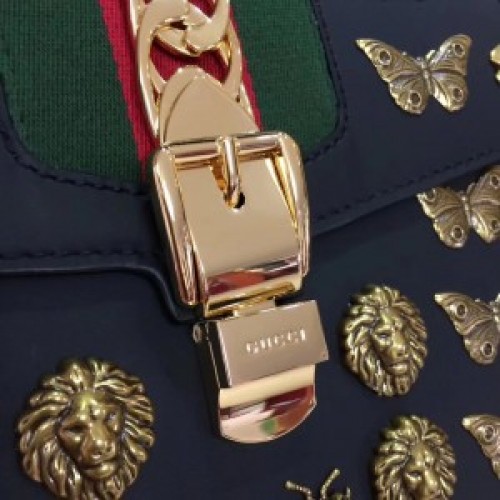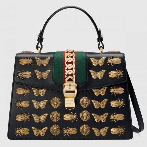 The Sylvie bag in a top handle shape with nylon Web embedded under the leather and decorated with a gold chain and buckle. The metal buckle closure was taken from the Houses archives. Made in Gucci's smooth, classic leather and embellished with metal cicadas, moths and lion heads from the Alchemist's Garden-a magical wellspring of signs and symbols that influence the Fall Winter 2017 collectsion.