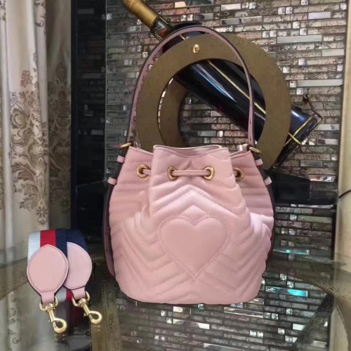 Gucci Sylvie Web Strap GG Marmont Chevron Quilted Leather Bucket Bag 476674 Pink 2017