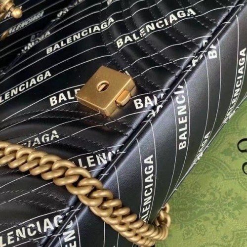 Exploring ideas of authenticity and appropriation within the fashion industry, Gucci Aria unveils The Hacker Project. In his latest collectsion, Alessandro Michele—in expressions of homage—infuses iconic Balenciaga silhouettes with Gucci codes in unique creations. Presented as a part of the selection, the GG Marmont shoulder bag is reimagined in Balenciaga print black leather.