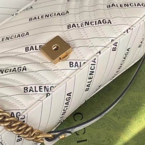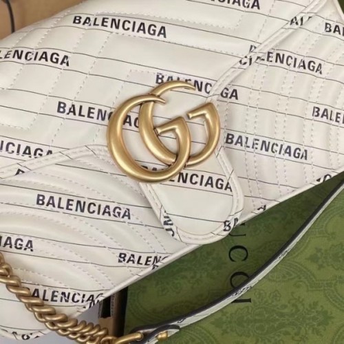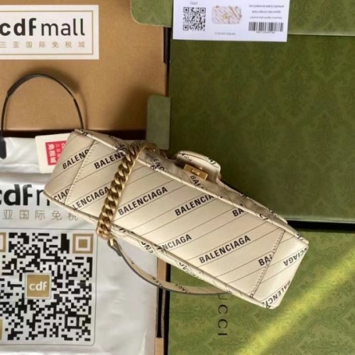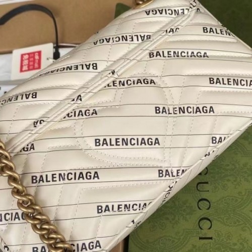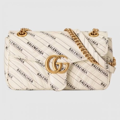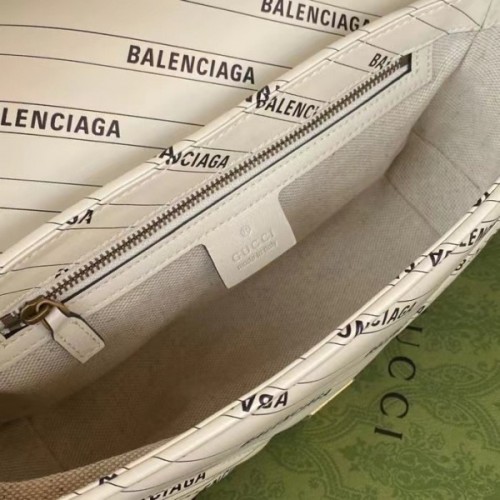 Exploring ideas of authenticity and appropriation within the fashion industry, Gucci Aria unveils The Hacker Project. In his latest collectsion, Alessandro Michele—in expressions of homage—infuses iconic Balenciaga silhouettes with Gucci codes in unique creations. Presented as a part of the selection, the GG Marmont shoulder bag is reimagined in Balenciaga print white leather.