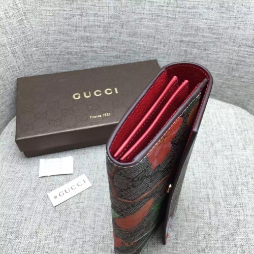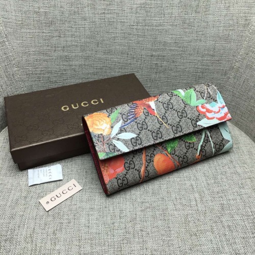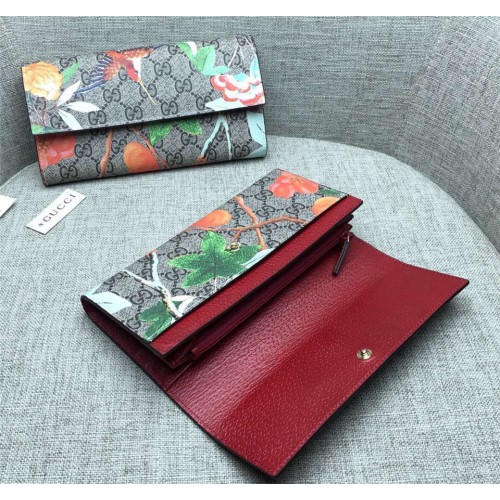 SIZE: W19*H10.5*D3 CMa continental wallet made in our gg supreme tian canvas. our new gucci tian print features a contemporary floral motif inspired by chinese landscapes depicted on 18th-century tapestries and screens. the floral pattern is made up of flowers, insects and birds-including dragonflies, butterflies and hummingbirds. the plants and creatures are represented through light and quick brushstroke-style graphics, with a three-dimensional effect printed on our gg supreme canvas.Beige/ebony GG supreme tian, made using an earth-conscious process, with red/brown leather trimSnap closureOne bill compartment, one side pocket, four card slots, and two flat pockets