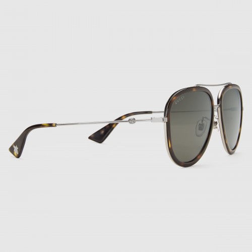 Aviator metal sunglasse from Gucci feature ruthenium metal with dark tortoiseshell acetate frame, ruthenium metal temples with dark tortoiseshell acetate tips and brown lens.