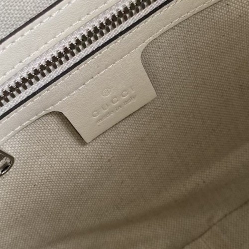 Connecting the House's past and present, archival codes appear in new ways with a contemporary twist. Playing with textures and materials the Guccio Gucci's monogram appears an embossed detail against a white leather base. The shoulder bag is completed with engraved metal feet.