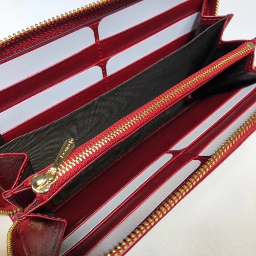 Now an emblem of the Rajah line, the tiger head appears on this cerise leather zip around wallet. The gold-toned feline has enameled details and is further enhanced with sparkling crystals. Reflecting the House's fascination with vintage designs, this element was inspired by a piece from fashion and jewelry designer Hattie Carnegie's 1940s archives.