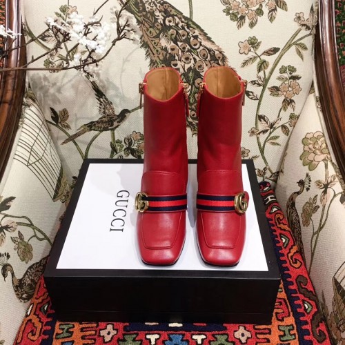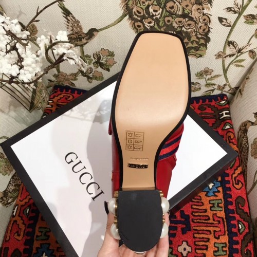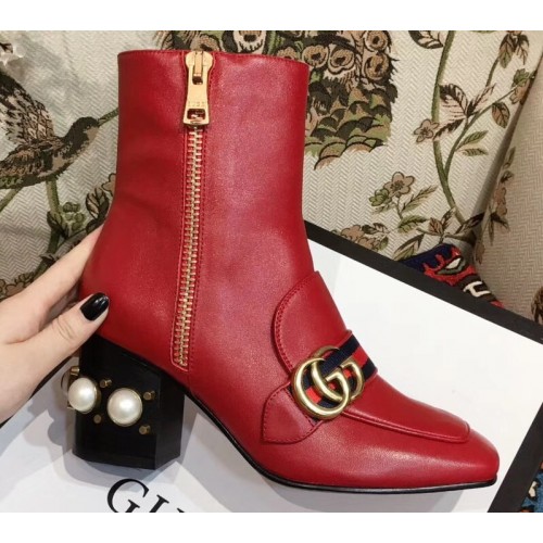 Gucci Web and Double G Leather Pearls Mid-heel Ankle Boots Red 2018