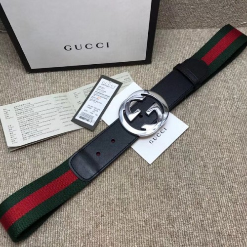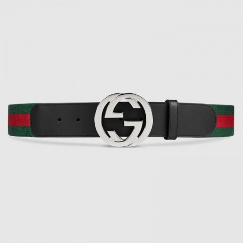 The interlocking G buckle belt with Gucci Web strap in green and red.