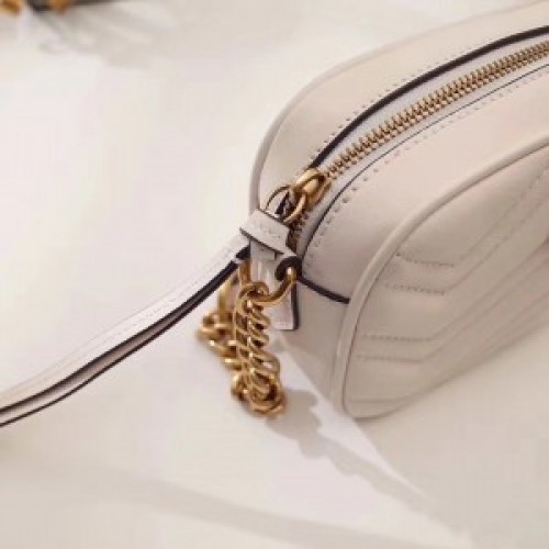 The mini GG Marmont chain shoulder bag has a softly structured shape and a zip top closure with Double G hardware. The chain strap has a leather shoulder detail. Made in matelassé leather with a chevron design and GG on the back.