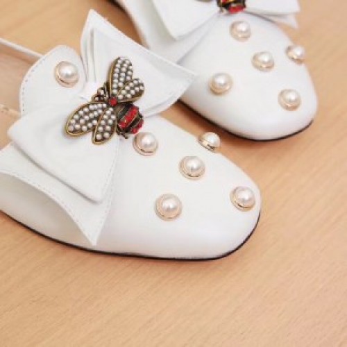 The point toe ballet flat pump is embellished with an oversize leather bow with center bee detail. The bee—encrusted with pearl effect studs and enamel details that reflect the Web stripe—was first introduced by Gucci in the 1970s.