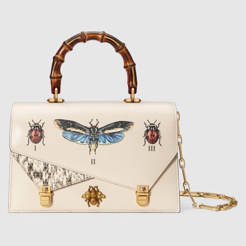 Part of Alessandro Michele's 'Alchemist's Garden' collectsion, Gucci's leather 'Ottilia' tote is printed with insects and butterflies numbered as they would appear in a display case. Paneled with black and white elaphe, this compact design opens to an accordion-style interior sized to stow your card holder, keys and compact. Carry it by the bamboo handle or by the optional chain shoulder strap.