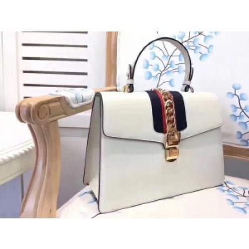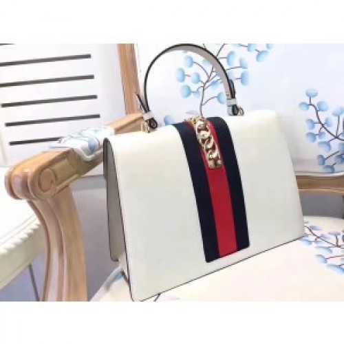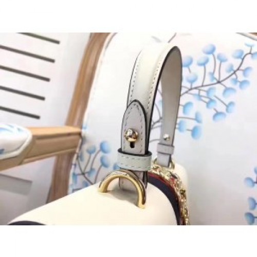 The Sylvie bag in a top handle shape with nylon Web embedded under the smooth leather and decorated ..