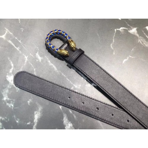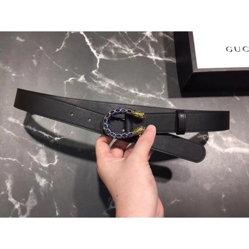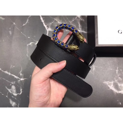 Gucci Width 3cm Leather Belt Black with Blue Crystal Dionysus Buckle