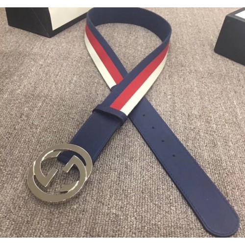 Gucci Width 4cm Sylvie Web and Leather Belt Blue with Interlocking G Buckle