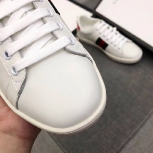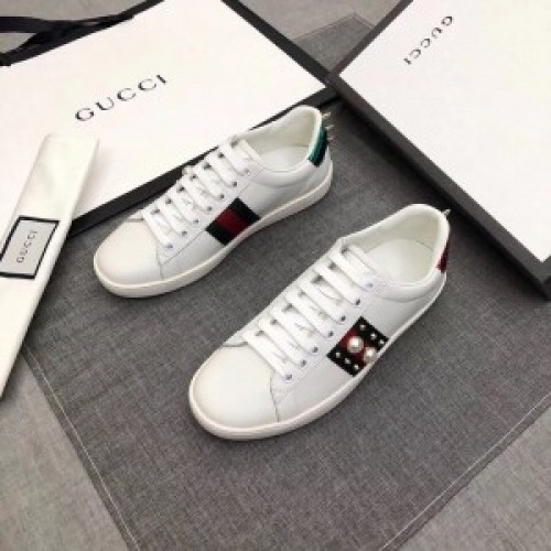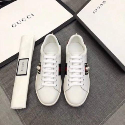 Spliced with signature webbings through the sides, the Gucci New Ace sneakers are a contemporary take on the brand's storied Italian heritage. A classic low-top style, they boast a lace-up silhouette in irresistibly smooth leather, trimmed with the hallmark Web stripe alongside luxe pearl studs.