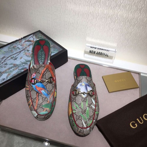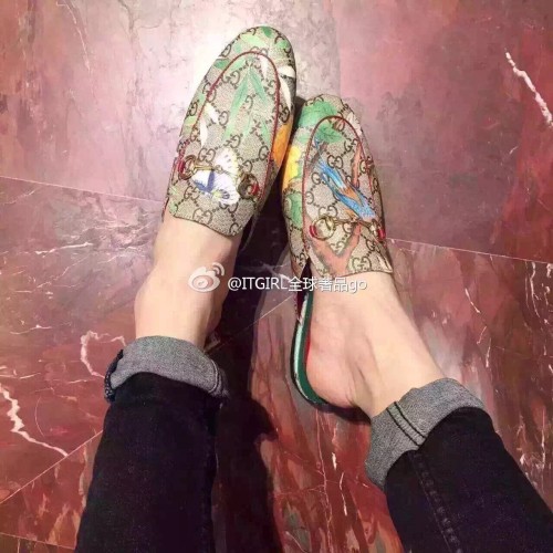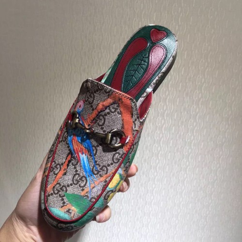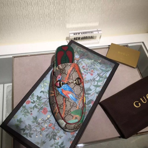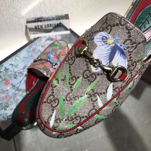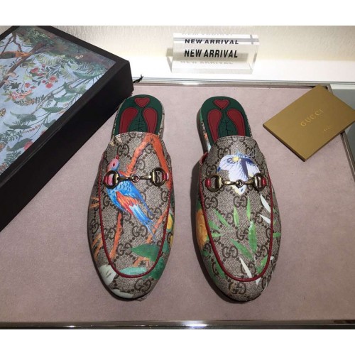 size:35-US 4.536-US 5.537-US 638-US 739-US 7.540-US 8.5The Princetown slipper made in our GG Supreme Tian canvas. Our new Gucci Tian print features a contemporary floral motif inspired by Chinese landscapes depicted on 18th-century tapestries and screens. The floral pattern is made up of flowers, insects and birds-including dragonflies, butterflies and hummingbirds. The plants and creatures are represented through light and quick brushstroke-style graphics, with a three-dimensional effect printed on our GG Supreme canvas.Beige/ebony GG Supreme Tian, a material with low environmental impact, with red leather trimWomen'sHorsebit detailElongated toeLeather soleBecause of the special placement of the print, each shoe in the pair will depict a slightly different Tian scene.Made in Italy