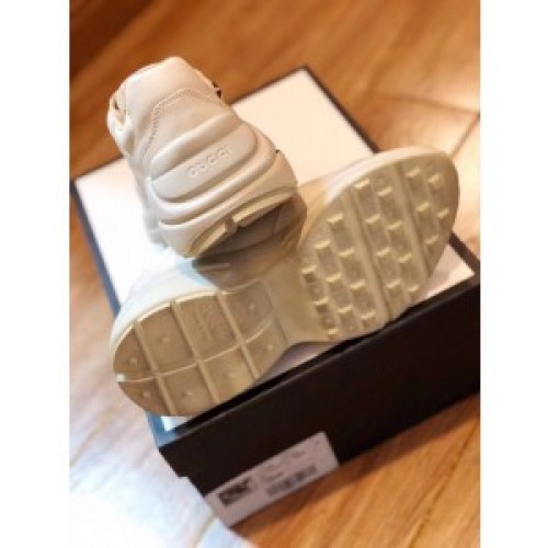 For Cruise 2019, Gucci staged a rave among the ancient graves of Alyscamps' Roman necropolis, in Arles. In the decadent setting, models walked a runway divided by flames, playing rock stars with looks that brought back ‘80s glam mainstays: thick makeup, spikes, laced-up leather, narrow denim and daring animal prints. The sneaker speaks to an era of metal in a distinctly Gucci way, with a rock band inspired print. Designed with a thick sole and chunky construction in distressed leather.