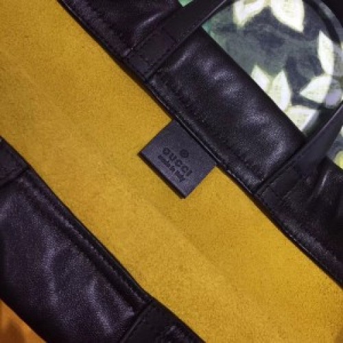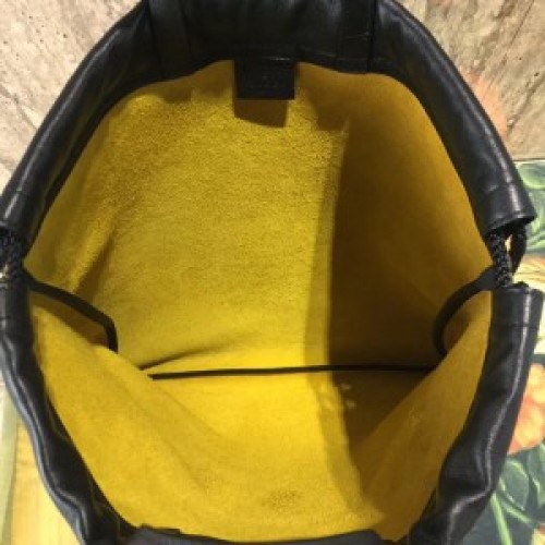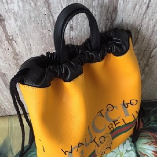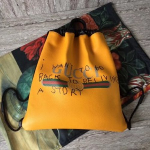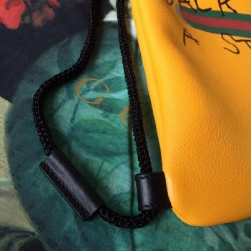 For Fall Winter 2017, artist Coco Capitán collaborated with Gucci on a special range of accessories and ready-to-wear that feature her signature phrases. The ironic and witty handwritten aphorisms appear over the Gucci vintage logo and bring together Coco Capitán’s offbeat sense of humor with the eclectic House aesthetic. This leather drawstring backpack is printed with the phrase "What are we going to do with all this future?" The two leather handles allow this style to also be worn as a tote.