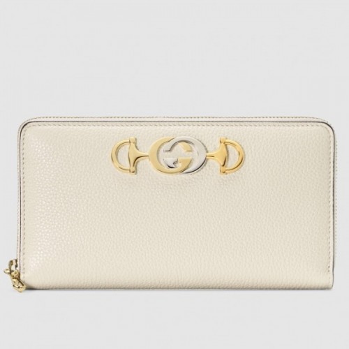 A white leather zip around wallet enhanced by the Interlocking G Horsebit, presented in gold- and silver-toned metals. Merging two of its most distinctive codes into one symbol: the Interlocking G Horsebit, the hardware is replicated from a rare piece from the Gucci archives, chosen for its contemporary appeal. Introduced in the evocative setting of the Théâtre Le Palace in Paris, the Gucci Zumi line takes its name from actress and experimental musician Zumi Rosow, who walked the Spring Summer 2019 runway carrying the bag.