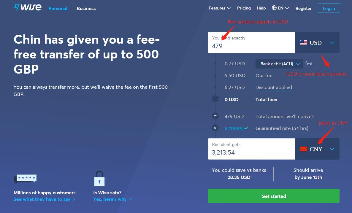 First, Fill in the exact amount of your order, and choose USD as Recipients currency, then click Get started