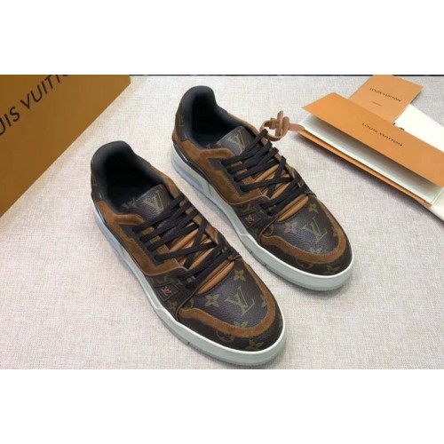For the first time, the iconic LV Trainer sneaker, launched at Louis Vuitton’s Spring-Summer 2019 menswear show, comes in the House’s signature Monogram canvas with brown suede calf-leather trim. This low-top model, inspired by vintage basketball sneakers, features an innovative gel-injected outsole with a motif of Monogram Flowers.