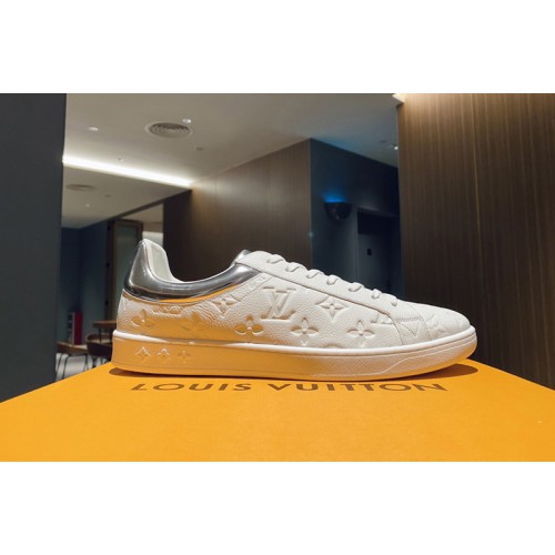 The Luxembourg sneaker is revisited in white grained calf leather embossed all over with Louis Vuitton’s iconic Monogram pattern. Notable for its simple, timeless design and extremely supple leather, this model is complemented by metallic trim on the collar. The rubber outsole is debossed with motifs of Monogram Flowers.