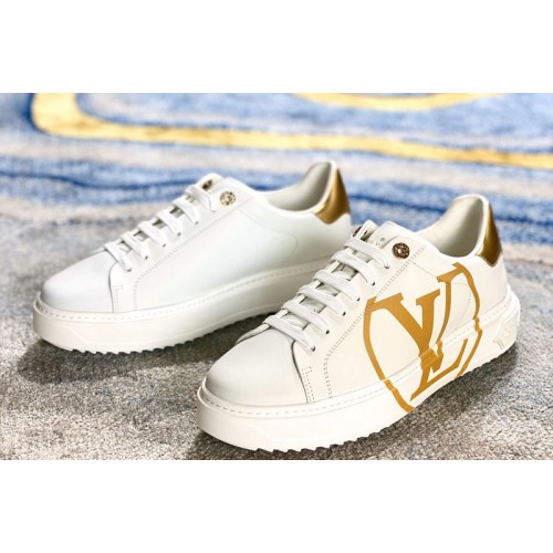 The iconic Time Out sneaker is revisited in soft, white calf leather with an oversized LV Circle signature on the side and matching metallic-leather trim. This model is distinguished by its fashionable, elevated outsole with a 3-D pattern of Monogram Flowers. Refined details, including Louis Vuitton-engraved, gold-tone eyelets, further enhance this design.