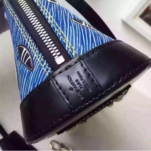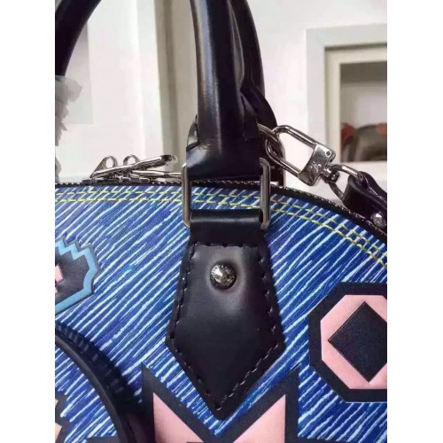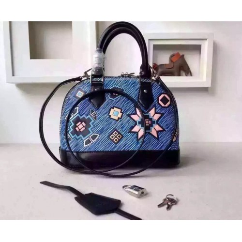 LOUIS VUITTON ALMA BB EPI LEATHER BLUE M50833SKU:a2411899800Size:25cmIt was a stand-out signature of the F/W 15 runway: Epi Azteque leather, made of Epi denim, introduced with the SS15 show and enriched with a stone washed white color, tattooed with joyfull ethnic motifs. Applied to the Alma, an iconic House shape, the result is a must-have bag that combines Vuitton heritage with Nicolas Ghesquière’s experimental attitude. It may also be one of the season’s most versatile pieces. The color story complements all manner of looks, and the sweet BB size can be carried in so many ways – by hand, over the arm, on the shoulder or cross-body.- Epi leather- Removable leather strap- Textile lining- Silver color metallic pieces- Double-zip closure with padlock and keybell- Riveted handles- Double smartphone inside pocket