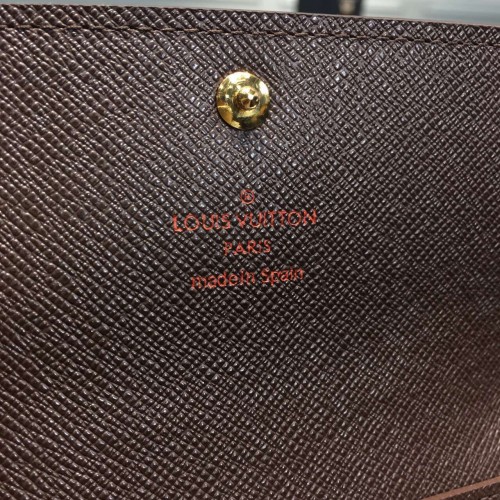 SIZE:11*9 CMCompact, cute and feminine, the Anaïs Wallet boasts an innovative shape with a double-sided opening. Durable Damier Ebène canvas and numerous pockets combine to make it an inspired choice for busy women. The name Anaïs comes from the western translation of Hannah which means "grace", reminiscent of the femininity every woman expresses.- Damier Ebene Canvas- 1 exterior zipped coin pocket- 6 credit card slots- 1 large compartment for bills- 2 smaller compartments for ID, notes and receipt- Grained calf leather linings- Golden color metallic pieces