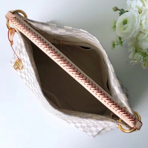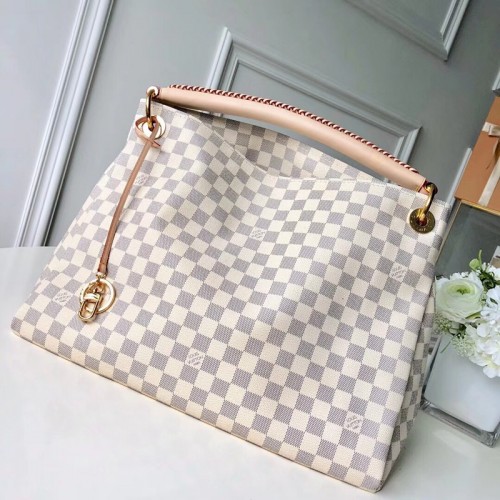 The Artsy MM looks fresh and feminine in supple Damier Azur canvas. Adorned with shiny golden brass and a chic bag charm, its exquisite handcrafted leather handle adds a luxurious crowning touch.