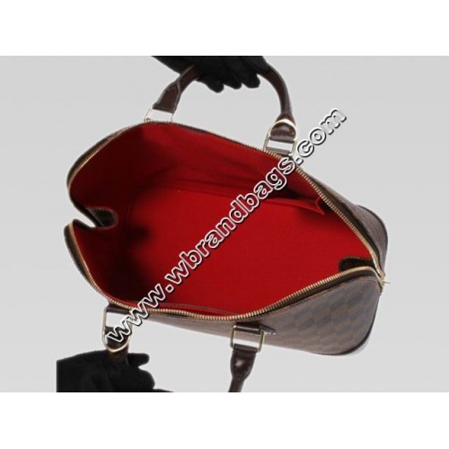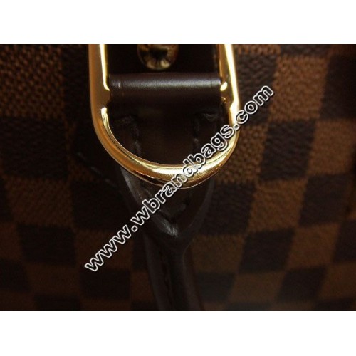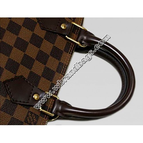 - Damier canvas, chocolate-colored smooth leather base and handles