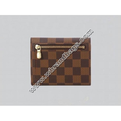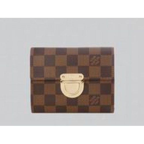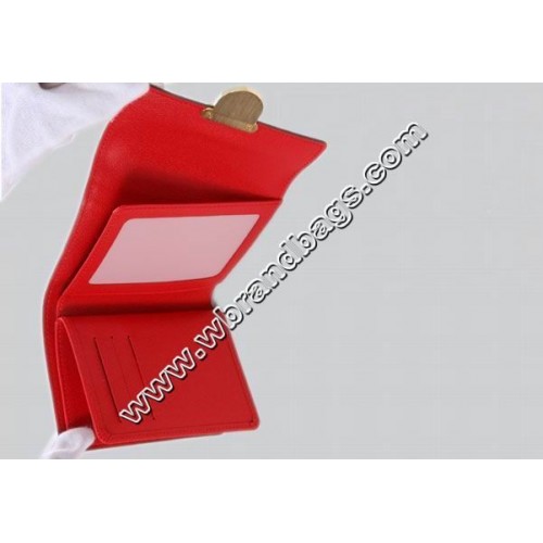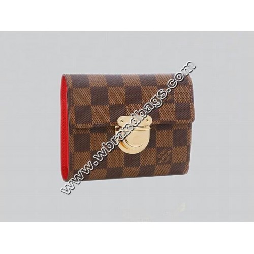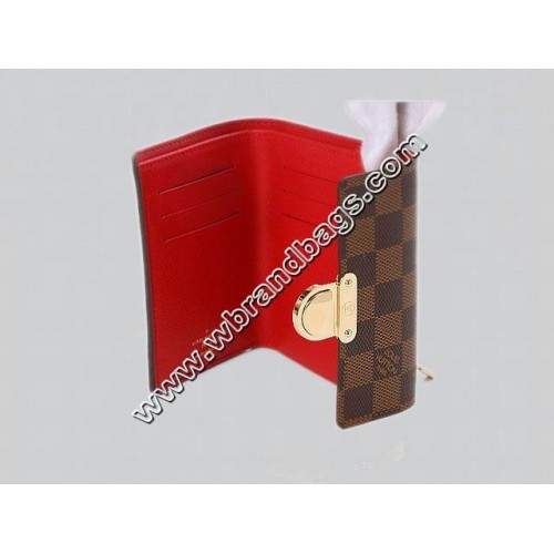 This wallet in Damier canvas lined with red leather has a press lock closure. It holds up to nine credit cards as well as change, bills and other papers.