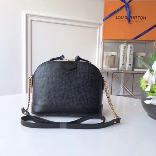 This adorable version of the ladylike Alma in grained Epi leather is a versatile day-to-evening piece. Trendy yet timeless, it features a long strap – perfect for cross-body wear – adorned with a golden-chain detail. Signatures include an embossed LV logo and a “Louis Vuitton Paris” patch.