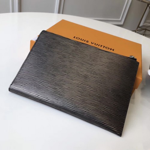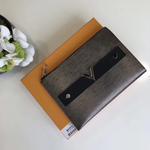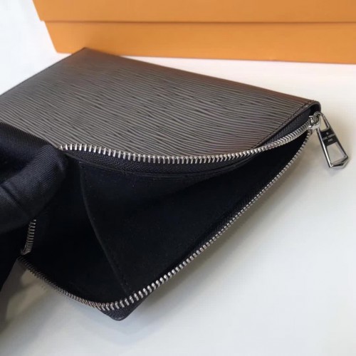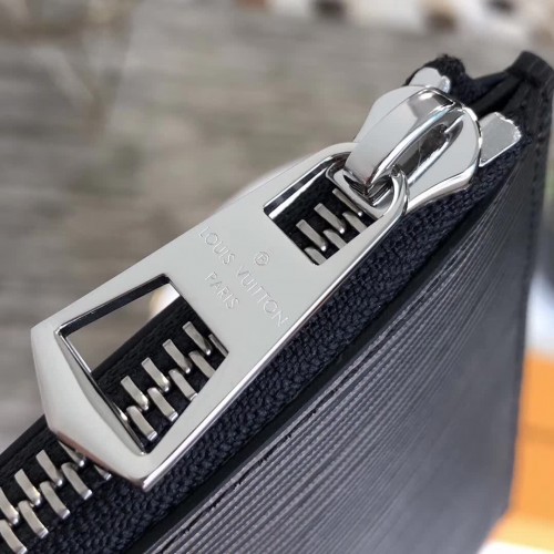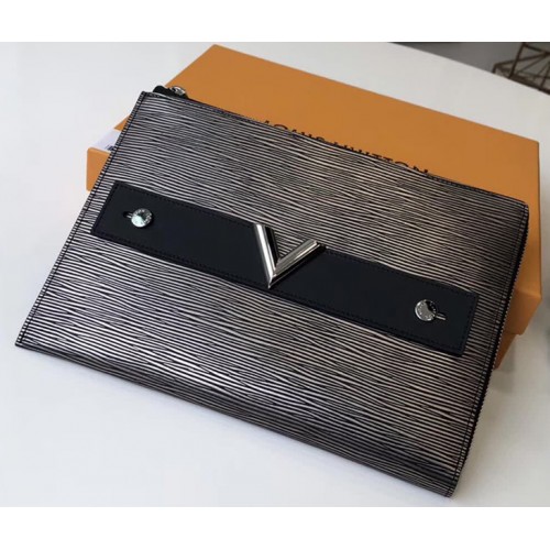 - 9.8 x 7 x 0.6 inches- Epi leather- Cowhide leather lining- Shiny silver colored metallic pieces- 1 large zipped opening