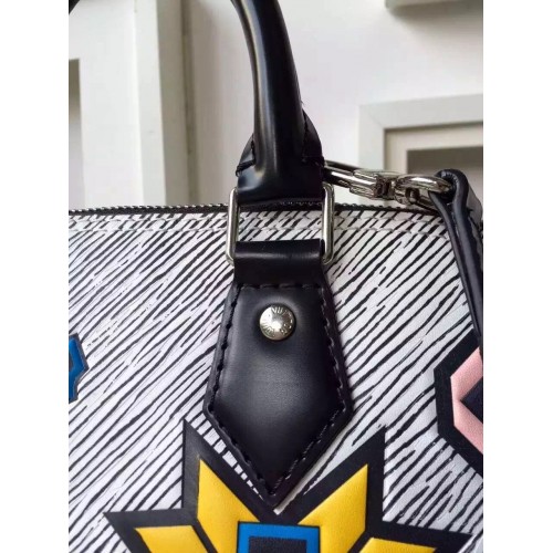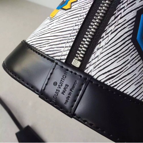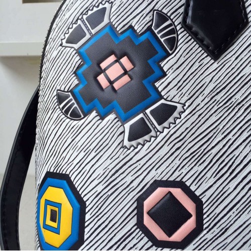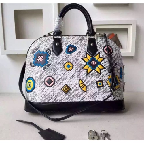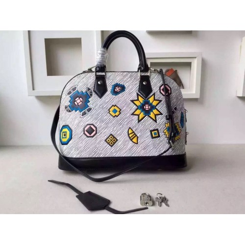 LOUIS VUITTON ALMA PM EPI LEATHER BLANC GRIS SKU: a2411-010SIZE: 32 CM- Epi leather- Removable leather strap- Textile lining- Silver color metallic pieces- Double-zip closure with padlock and keybell- Riveted handles- Double smartphone inside pocketIt was a stand-out signature of the F/W 15 runway: Epi Azteque leather, made of Epi denim, introduced with the SS15 show and enriched with a stone washed white color, tattooed with joyfull ethnic motifs. Applied to the Alma, an iconic House shape, the result is a must-have bag that combines Vuitton heritage with Nicolas Ghesquière’s experimental attitude. It may also be one of the season’s most versatile pieces. The color story complements all manner of looks, and the sweet BB size can be carried in so many ways – by hand, over the arm, on the shoulder or cross-body.
