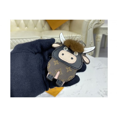 The Chinese New Year bag charm and key holder features an ox-shaped charm, expertly crafted from an elegant combination of calf leather and iconic Monogram canvas. Mink fur accents and LV studs add an additional layer of luxury to this dual-function piece. Expert craftsmanship is displayed in the finely engraved LV signature on the snap hook and ring.