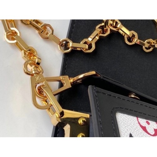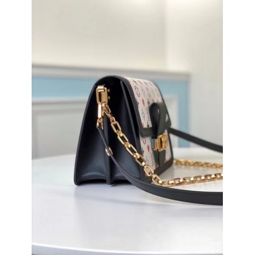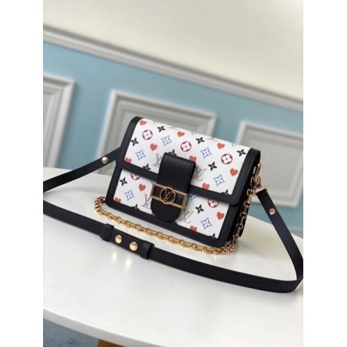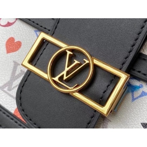 In colorfully graphic Game On Monogram canvas with black leather trim, the structured lines of the Dauphine MM handbag are reborn for Cruise 2021. On this Monogram print some of the Monogram Flowers are replaced with red hearts. With its gold-color chain strap and signature lock, the Dauphine dresses up any outfit.