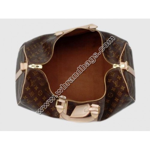 The Keepall is a classic of the Louis Vuitton travel bag collectsion. This largest version in Monogram canvas features rounded leather handles, a double zipper and a removable shoulder strap.
