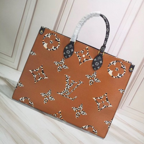 The Onthego tote bag takes on a bold new look in coated canvas with a print combining multiple sizes of the Monogram motif with leopard and zebra skin patterns. Its generous capacity, removable shoulder straps, and top handles make the Onthego perfect for everyday use.