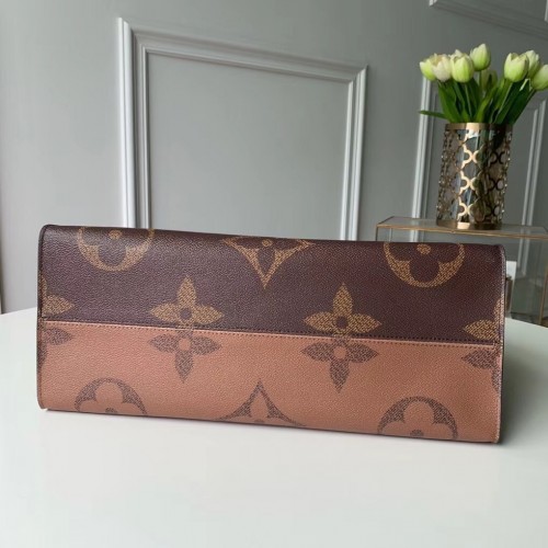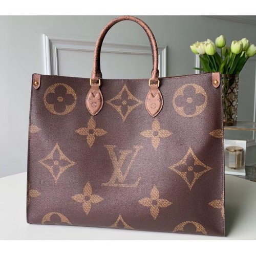 Fashioned from Monogram Giant canvas, the Onthego tote bag is as striking as it is practical. A Monogram Reverse pattern on the sides and handles creates a stylish contrast in color and scale. With its generous capacity, removable shoulder straps and iconic Toron top handles, this versatile GM model is an ideal bag for everyday wear.
