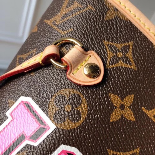 This Neverfull MM tote bag is fashioned of Monogram canvas and trimmed in natural leather. It pays tribute to the Louis Vuitton travel and trunk-making heritage with a mix of patches featuring House emblems, twisted in a playful and contemporary way. Spacious but not bulky, structured yet supple, the Neverfull is always exactly what you need it to be.