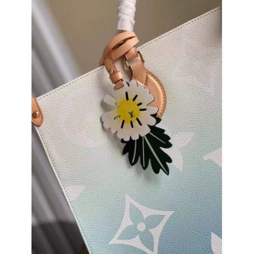 This OnTheGo GM tote bag is made from colored Monogram Giant canvas and is accessorized with a colorful leather flower charm. Roomy and comfortable to carry thanks to its shoulder straps and rolled leather top handles, this tote is perfect for everyday use. Numerous inside pockets including a zipped flat pocket keep essentials organized.