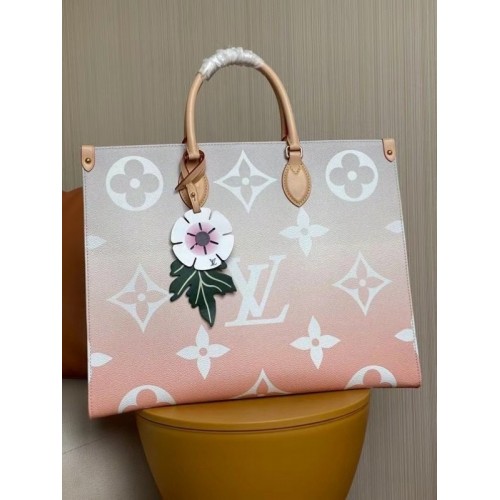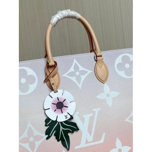 This OnTheGo GM tote bag is made from colored Monogram Giant canvas and is accessorized with a colorful leather flower charm. Roomy and comfortable to carry thanks to its shoulder straps and rolled leather top handles, this tote is perfect for everyday use. Numerous inside pockets including a zipped flat pocket keep essentials organized.