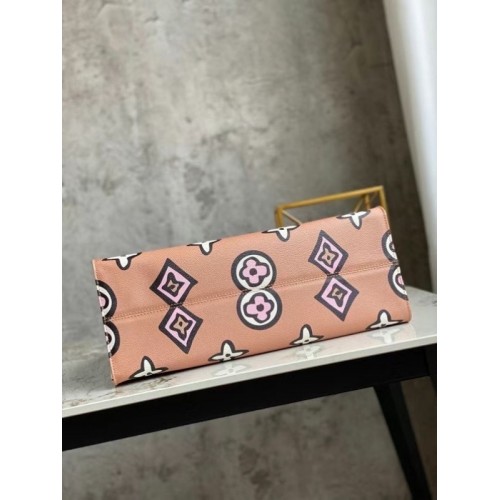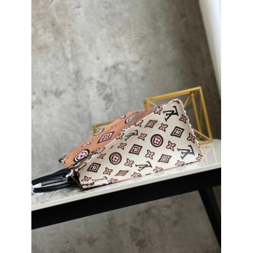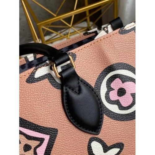 This Onthego GM carryall wears a graphic Monogram print this season, created especially for the Wild at Heart capsule. Inspired by an archival design, the pattern makes a striking fashion statement on this roomy tote, a stylish companion for business, shopping or travel. Long shoulder straps and twin Toron top handles provide several comfortable carry options.