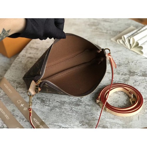 Structure:-Monogram canvas bag, cloth lining-golden brass accessories-zipper closure-detachable belt that can be easily fastened to the D-ring attached to many Louis Vuitton handbags