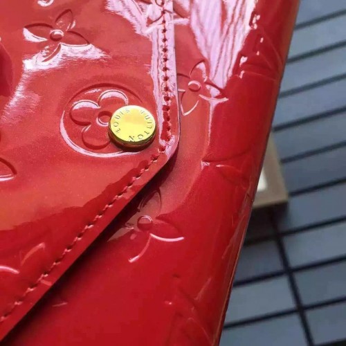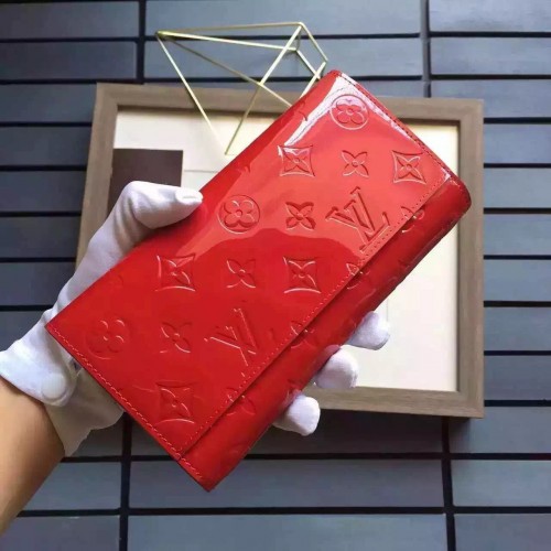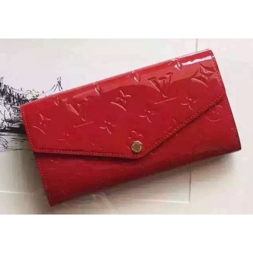 LOUIS VUITTON SARAH WALLET MONOGRAM VERNIS Cherry M90208SKU:1C018-006Size:19*10cmThis envelope-style Sarah wallet combines an exterior in discreetly embossed Monogram Vernis leather with an ingeniously designed interior featuring a variety of pockets and credit card slots.- 16 credit card slots, two large compartments for banknotes, zippered coin pocket, two flat interior pockets, one exterior back pocket- Calf leather lining- Golden color metallic pieces