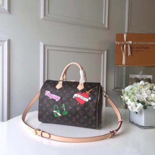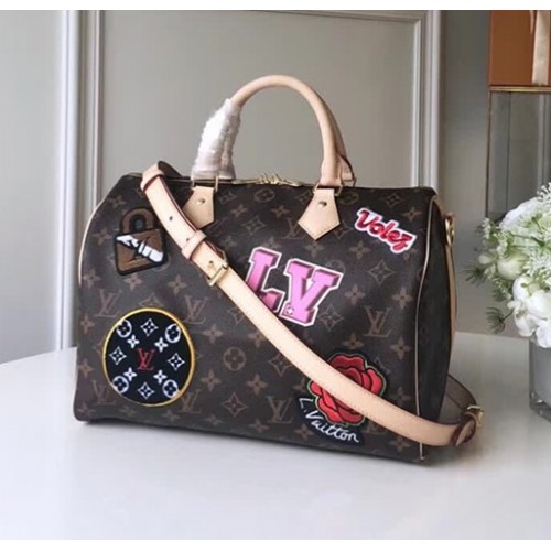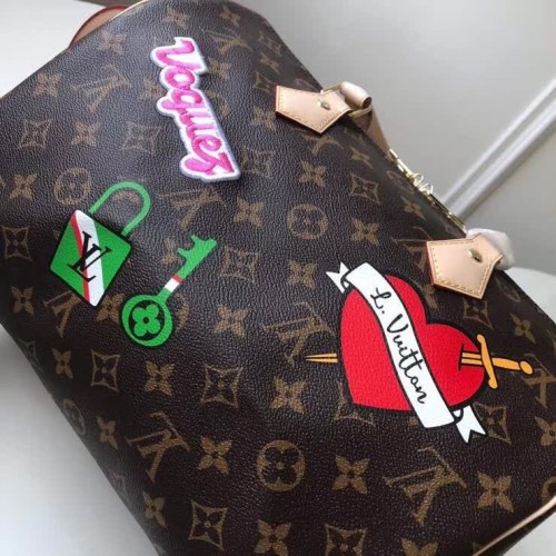 This Speedy 30 travel bag gets a twist thanks to the mix of printed and embroidered patches adorned with modern redesigns of iconic Louis Vuitton signatures. Originally designed for travelers in the 1930s, with a convenient strap for cross-body wear, today’s Speedy 30 is a perfect city bag – supple, lightweight and eternally stylish.