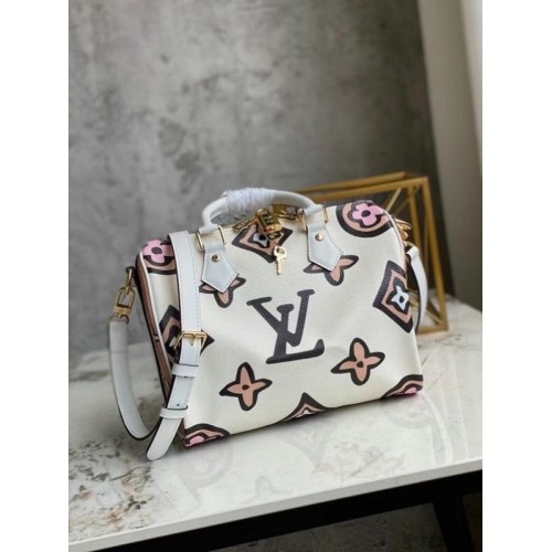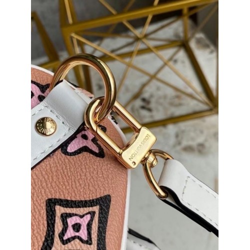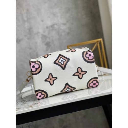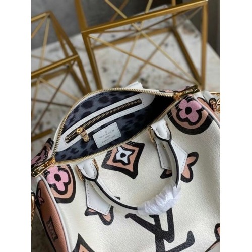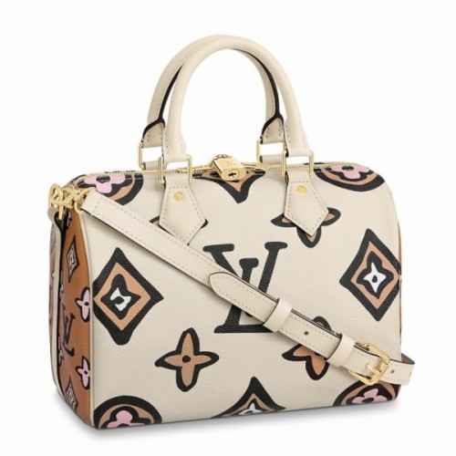 This Speedy Bandoulière 25 handbag comes from the Fall 2021 Wild at Heart capsule. The classic shape is dressed in an exclusive Monogram print with a striking hand-painted look, inspired by an archival House motif from 1924. Because they play out as neutrals, the bag's luminous autumnal colors create a stylish complement for the season’s silhouettes.