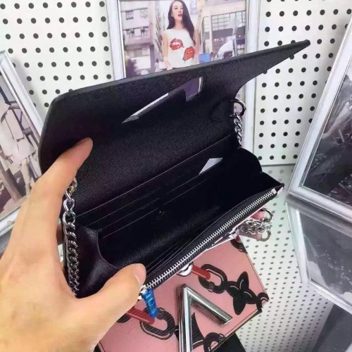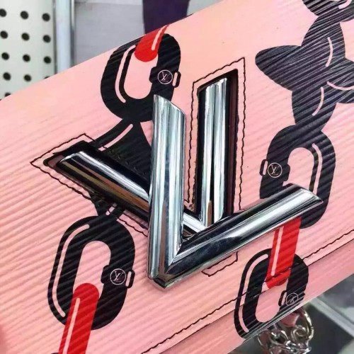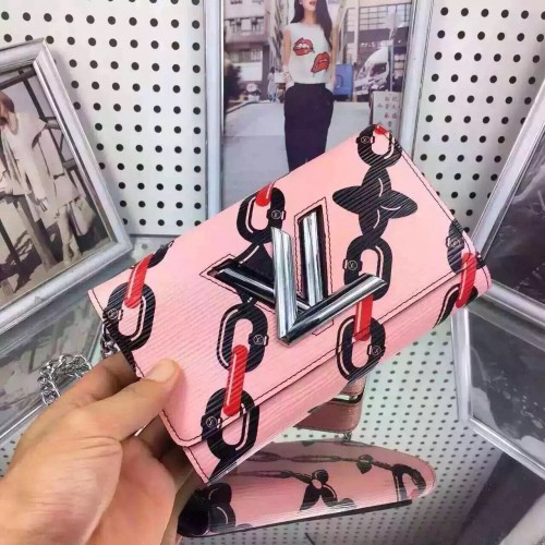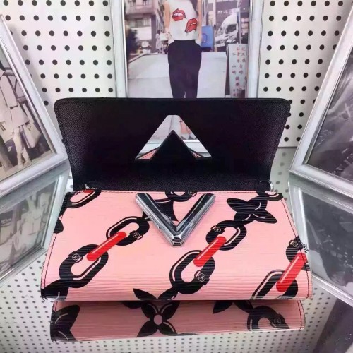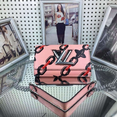 size:19*12*3 cmThe chain print, incorporating Louis Vuitton's Monogram flowers, was a key theme of the Spring/Summer 2016 fashion show. It adorns the Twist chain wallet in Epi leather, which can also be worn as a shoulder or cross-body bag. The playful Twist turn-lock features an L that transforms into a V with a twist of the fingers.- 6 credit card slots- 1 zipped interior pocket for coins- 1 large gusseted compartment for banknotes- 1 flat pocket for tickets and notes- Chain- Embossed and printed Epi leather- Cowhide leather lining- Silver color metallic pieces- Signature Twist turn-lock